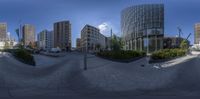 Modern architecture in Berlin, with hard shadows creating a dramatic urban scene. Office buildings with sleek designs dominate the business district. A cloudy day in Europe adds depth to the city landscape.