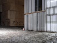 A night view of modern architecture in Berlin, Germany. The city lights illuminate the open spaces and cobblestone roads. The unique design of the buildings and urban landscape create a vibrant city life.