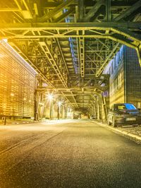 A symmetrical urban scene in Berlin, Germany. The night sky casts tints and shades on the city streets. The road under the overpass is illuminated by street lights and lined with parked cars.