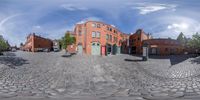 a 360 - view photo shows a city square with the building and its surrounding entrance