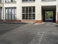 a parking lot near a building with windows and a no parking sign outside the building