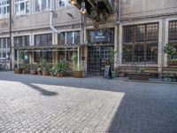 A charming corner in Berlin, Germany, with a cobblestone road surrounded by buildings and trees. The courtyard of a café is adorned with potted plants. The urban design and architecture reflect the vibrant city life of Europe's art district.