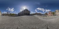 A 360-degree view of a cobblestone road in Berlin, Germany. The road is lined with historic buildings and leads to a large dome building. The clear sky and sunlight create a vibrant atmosphere. This iconic cityscape captures the essence of Berlin.