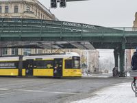 A cyclist navigating the snowy roads of Berlin, Germany. The grey sky adds to the urban atmosphere. Vehicles, including buses and cars, move under an elevated railway. A typical winter day in Europe.