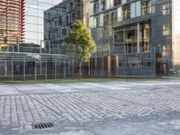 This image captures a modern architectural scene in Berlin, Germany. The photo shows a spacious paved square flanked by large buildings with glass facades. The open space and clean lines reflect the city's urban design and European influence. In the early morning light, the quiet streets and empty public spaces create a sense of calm. The image represents the mix of residential and business areas in Berlin's suburban neighborhoods. This photo is a perfect representation of Berlin's modern and vibrant urban landscape.