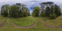 A scenic dirt road in Berlin, Germany, surrounded by lush vegetation and towering trees. The autumn landscape features deciduous and evergreen trees. Clouds dot the sky above the picturesque European forest.
