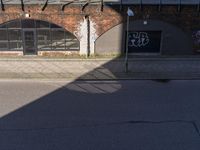 an empty street that has graffiti on the side of it, with some signs and windows