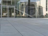 a man wearing a suit walking outside a glass building with steps, and stairs,