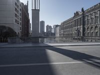 a long street in an urban area, with many buildings in the background and people crossing over it