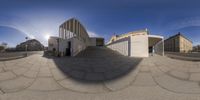 A stunning fish-eye view of the James Simon Gallery, a modern architectural masterpiece in Berlin, Germany. The building's unique design and use of concrete create a striking contrast against the cityscape. A must-visit tourist attraction in the metropolitan area.