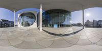 A massive modern building with a multitude of windows in the heart of Berlin's business district. The sleek, monochrome facade reflects the clear sky above, while the surrounding urban landscape adds to the city's vibrant atmosphere.