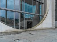 A modern glass wall in Berlin, Germany. The surface reflects the urban design of the city, with paver pathways and architectural features. The cloudy day adds a dramatic touch to the European cityscape.