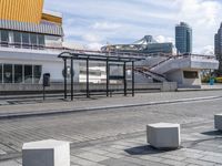 A modern high-rise skyscraper in Berlin, Germany stands tall against the clear sky. The urban design and architecture create a striking facade. The city's infrastructure and road surface add to the vibrant city life.