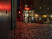A vibrant night scene in Berlin, Germany. Cobblestone streets and brick buildings create a classic architectural backdrop. The neon lights of a motel sign illuminate the restaurant on the bustling street, giving a glimpse into the city's lively nightlife.