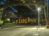 A dark night in Berlin, Germany. Streetlights illuminate the city, reflecting off the asphalt road. The underpass leads to a bridge, while a train station stands tall in the background. Artificial light creates a vibrant urban atmosphere.