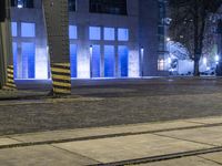 This stunning stock photo shows a vibrant night view of the city of Berlin in Germany. The image features illuminated buildings and roads, with a beautiful combination of yellow and purple tints and shades. The cityscape is captured during the dawn, creating a dramatic contrast between the dark sky and the brightly lit buildings. The foreground showcases a well-maintained road surface with asphalt flooring, bordered by trees and vegetation. The image also includes a factory with a rectangular facade and windows, adding an industrial touch to the urban scenery. In the distance, a pier, warehouse, and harbor with cranes and jetty can be seen, illustrating Berlin's connection to its waterways. The image provides a unique perspective on the bustling city and its prominent features. This stock photo is perfect for any project related to urban landscapes, cityscapes, Germany, Europe, or industrial settings.