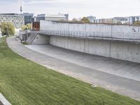 A modern architecture building in Berlin, Germany, is surrounded by open space and vegetation. People can be seen on a bike trail and several other buildings are in view. The clear sky reflects off the concrete surface of a nearby bridge.
