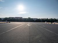 A sunny day in Berlin, Germany. The asphalt road leads through a grassy open space, with trees lining the thoroughfare. The clear sky and horizon create a beautiful urban landscape.