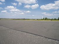 An open space in Berlin, Germany. The clear sky contrasts with the asphalt road and the nature surrounding it. The horizon is dotted with cumulus clouds, creating a serene landscape.