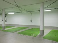 A modern architecture parking garage in Berlin, Germany. The concrete surfaces and flooring create a sleek and contemporary look. Green accents bring a touch of nature to the interior design. A state-of-the-art charging station is available for electric vehicles.