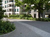 A picturesque cobblestone street in Berlin lined with modern residential buildings. The street is adorned with lush vegetation and greenery. The perfect fusion of urban architecture and natural elements.