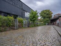 Industrial warehouse in Berlin, Germany, showcasing rugged urban design. Cobblestone road leads to a wet storage depot with vegetation. Cloudy day highlights the city's manufacturing quarter.