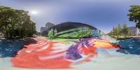 a view of a half pipe with graffiti on it at a skate park in a city