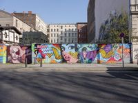 This is an image of a colorful graffiti wall in Berlin, Germany. The vibrant mural stands out against the clear sky, showcasing the urban art scene in this metropolitan area. The street art adds character to the residential neighborhood, adding pops of color to the city streets. This photo represents a typical day in Berlin, where art and culture are interwoven into the fabric of the city. Explore the streets of Berlin and discover the vibrant visual arts scene that makes this city an art lover's paradise.