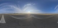 three different views of an empty runway on the side of a road at sunset with a bright blue sky
