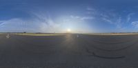 Aerial view of Tempelhof Airport in Berlin, Germany. The open space and clear sky create a calm atmosphere. The runway stretches straight down the road, with a plane visible on the tarmac. A symmetrical urban design surrounded by greenery and water resources.