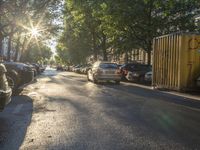 Sunshine illuminates the parked cars on a tree-lined street in Berlin, Germany. The vibrant autumn colors of the vegetation contrast with the wet road surface. A picturesque scene in a European city.
