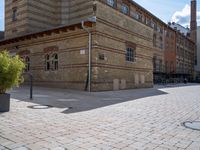 This is an image of a classic brick wall in Berlin, Germany. The architecture showcases the city's urban design, with a combination of warehouse and factory buildings. The clear sky above creates a sharp contrast with the hard shadows cast by the buildings. In the foreground, an open courtyard is visible, adding an element of open space to the city's landscape. This photo captures the essence of city life in Berlin, with its mix of classic and modern architecture. It represents the unique urban atmosphere and cultural heritage of Europe.