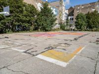 This image captures the vibrant urban atmosphere of Berlin, Germany. The city is known for its unique urban design and art district. In the foreground, a basketball court with a concrete surface can be seen, adorned with graffiti on the walls. The clear sky provides a backdrop for the Hinterhof, or courtyard, surrounded by buildings. The rugged appeal of the city is highlighted by the combination of open space, graffiti, and urban elements. This photo represents a typical day in Berlin's urban landscape.