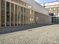 An urban courtyard in Berlin, Germany displaying a mix of classic and modern architecture. The cobblestone road and brick buildings create a charming atmosphere. Clear skies enhance the shadows and highlight the intricate details of the structures.
