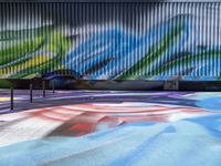 A vibrant street art mural in the urban courtyard of Berlin, Germany. Multicolored graffiti adorns the walls, adding to the artistic atmosphere of the city. Modern architecture and open spaces create a unique urban design.
