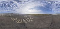 An empty runway at Tempelhof Airport in Berlin, Germany. The sky is reflected in a circular pattern, creating the illusion of an upside-down sky. The calm and symmetrical landscape is a perfect example of Berlin's urban design and architectural infrastructure.