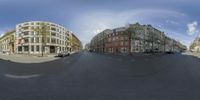 there is a fish eye view from the street corner that is at this point, the sky is very bright