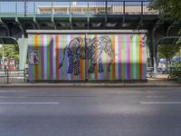 a brightly colored mural with an elephant and a zebra on a wall at a city street