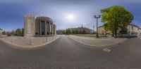 this 360 - vision lens image of an empty street shows a building and trees with a lightpost
