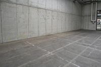 Spacious warehouse in Berlin, Germany, showcasing modern industrial architecture. Grey concrete walls and flooring contrast with the open space and storage areas. A fire hydrant adds a touch of utility.