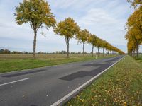 This is an image of a road in Berlin, Germany. The gloomy and grey sky contrasts with the lush green vegetation along the road. The autumn landscape is filled with trees and grass. The asphalt road surface stretches into the distance, leading to land lots and agricultural fields. This photo represents the beautiful nature and scenery of Berlin, Europe. It captures the atmosphere of a cloudy day in Germany.