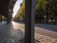 An autumn day in Berlin's Kreuzberg district. Curb with cobblestone road leads to a bustling city street. Metal poles and trees create shadows against a clear sky. The perfect European urban scene.