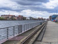 A modern office building in Berlin, Germany, overlooking a picturesque lake. Cloudy day adds dramatic atmosphere to the scene. European architecture and cityscape are reflected on the water's surface. Busy road and fence complete the urban landscape.