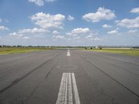 Aerial view of the Tempelhof Airport runway in Berlin, Germany. The asphalt road stretches out into the open landscape, with clear skies and fields surrounding it. A perfect space for recreational activities and enjoying nature.