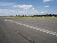 A scenic view of Tempelhof Airport in Berlin, Germany. The open space and clear sky create a picturesque landscape. The asphalt road surface leads to a grassy recreation area surrounded by trees.