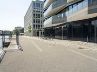 This image captures the essence of modern architecture in Berlin, Germany. The clear sky provides a backdrop for the impressive facade of two large residential and office buildings. The streets below are empty, showcasing the urban design and spacious public spaces. The city's mix of residential and business districts can be seen in this photograph. The cobblestone surface adds to the charm of the European city. This image represents the thriving real estate and business industry in Berlin, making it an ideal choice for property developers and urban design enthusiasts.