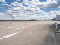 A modern architectural marvel in Berlin, Germany. The building's sleek design contrasts with the concrete streets and parking deck. Open spaces and grassy areas provide a refreshing break from the urban design. Clear skies and cumulus clouds dot the horizon.