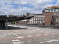 This is an image of a modern architecture building in Berlin, Germany. The cityscape features a parking lot with asphalt roads and concrete streets. The clear sky contrasts with the windows and brick facade of the classic architecture buildings in the background. The urban design includes a fence surrounding the parking deck and parking garage. The scene represents the blend of classic and modern architecture in Berlin, showcasing Europe's unique urban landscape. This photo captures a typical day in Berlin, with trees and clouds adding to the overall aesthetic.
