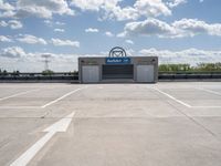 This image captures a parking lot in Berlin, Germany. The modern architecture of the parking garage is reflected in the concrete streets and open spaces. The clouds in the clear European sky provide a beautiful backdrop to the scene. It is a typical day in Berlin, with cars parked in the parking deck of a business. This photo represents the intersection of architecture and urban life in Europe.