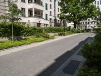A modern residential area in Berlin, Germany. The city's urban design is showcased through its architecture, cobblestone roads, and lush vegetation. Hard shadows from the buildings create striking visual contrasts on a sunny day.